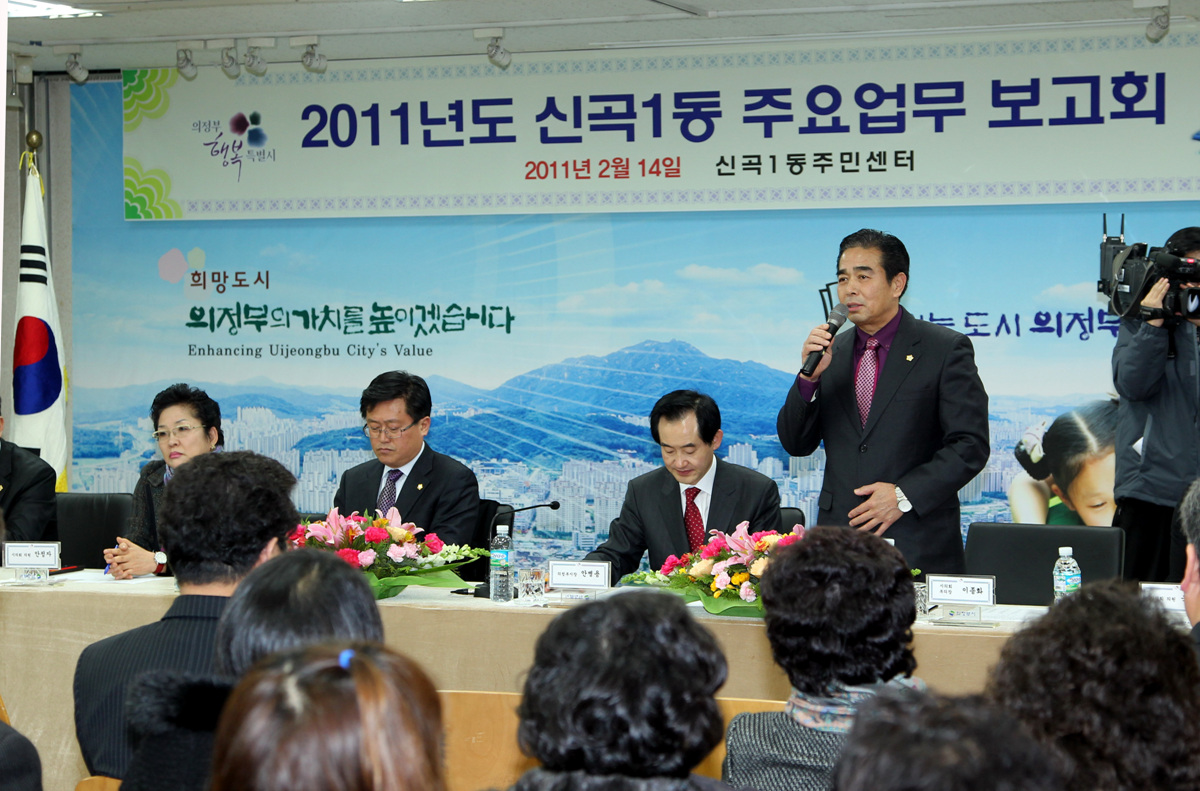 이종화 부의장은 2011. 2. 9일 부터 2. 18일 까지 신묘년 새해를 맞아 "희망도시 의정부"의 새로운 비젼과 의정 운영방향에 대하여 시민과 함께하는 기회를 갖고자 신곡1동, 신곡2동 등 2011년도 동 주민센터 주요업무보고회에 참석하였습니다. 이번 동 업무보고는 2011년도 동 주요업무 보고와 현안사항을 설명하고 주민제안 및 주민들의 애로ㆍ건의사항을 청취하는 순으로 진행되었으며 현안사항에 대해 주민들의 생생한 목소리를 듣고, 사업 추진현장을 살펴봄으로써 주민과 소통하는 시간이 되었습니다.