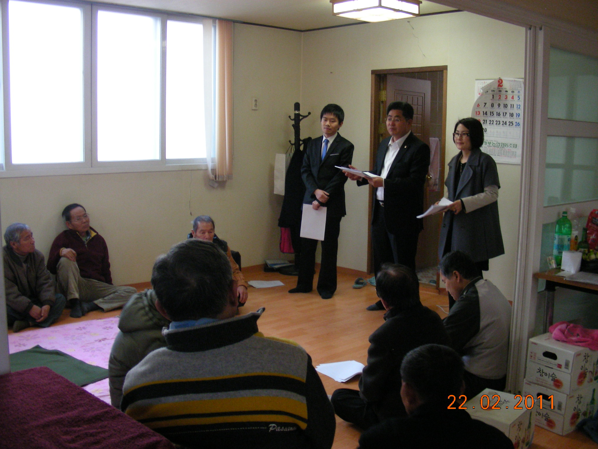 2011. 2. 22 (화), 이은정 의원은 고산동 정자마을 주민들과 도시개발사업 추진 관련 민원사항에 대하여 논의하는 시간을 가졌습니다.