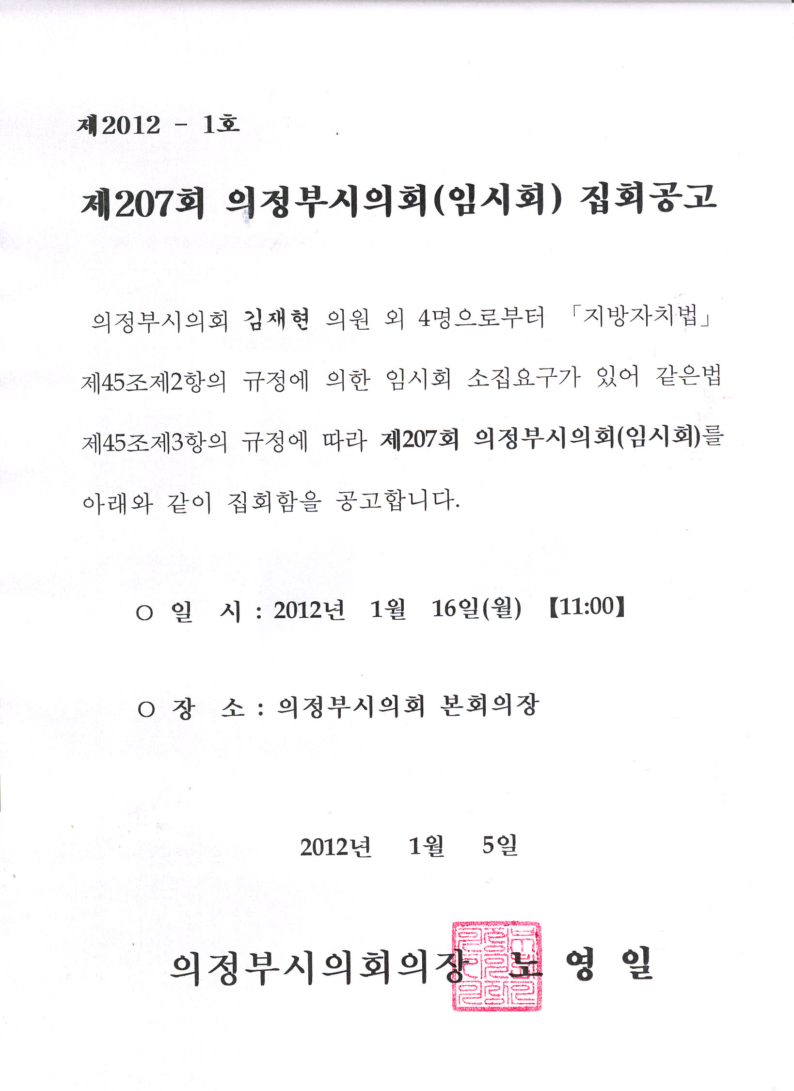 제2012 - 1호 제207회 의정부시의회(임시회) 집회공고 의정부시의회 김재현 의원 외 4명으로부터 「지방자치법」 제45조제2항의 규정에 의한 임시회 소집요구가 있어 같은법 제45조제3항의 규정에 따라 제207회 의정부시의회(임시회)를 아래와 같이 집회함을 공고합니다. ○ 일 시 : 2012년 1월 16일(월) 【11:00】