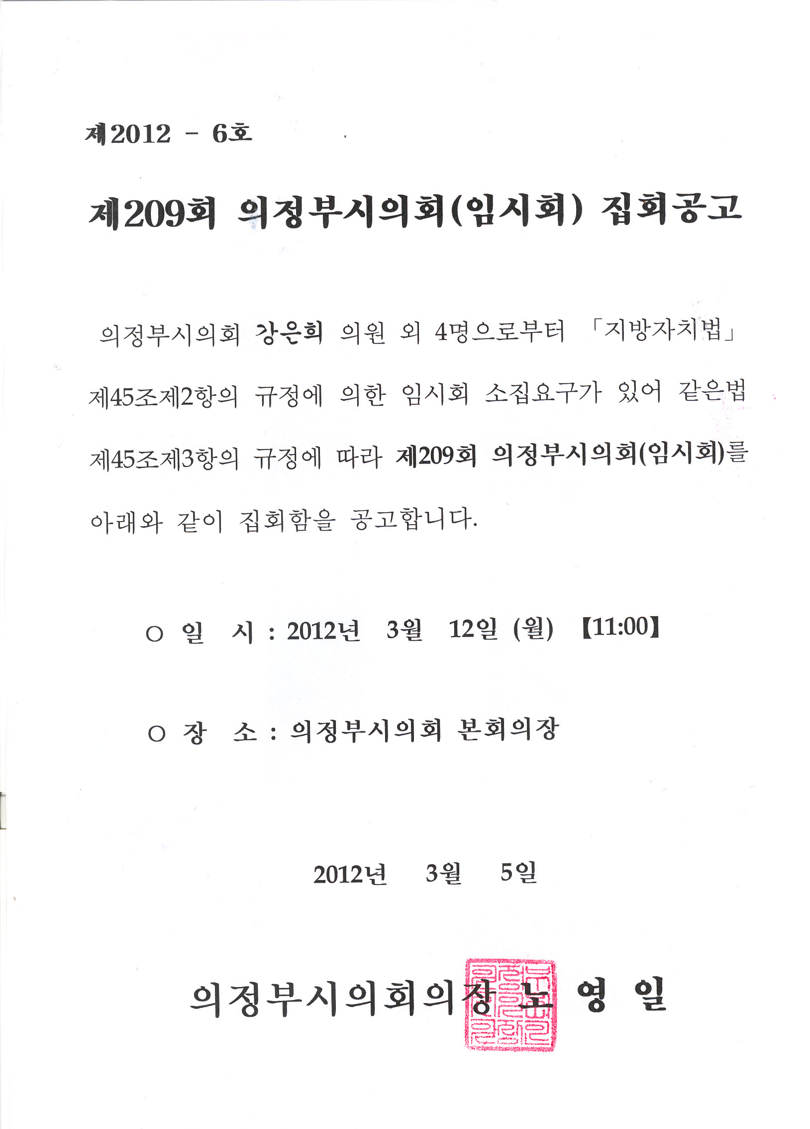제209회 의정부시의회(임시회) 집회 공고 관리자 2012-03-06 130