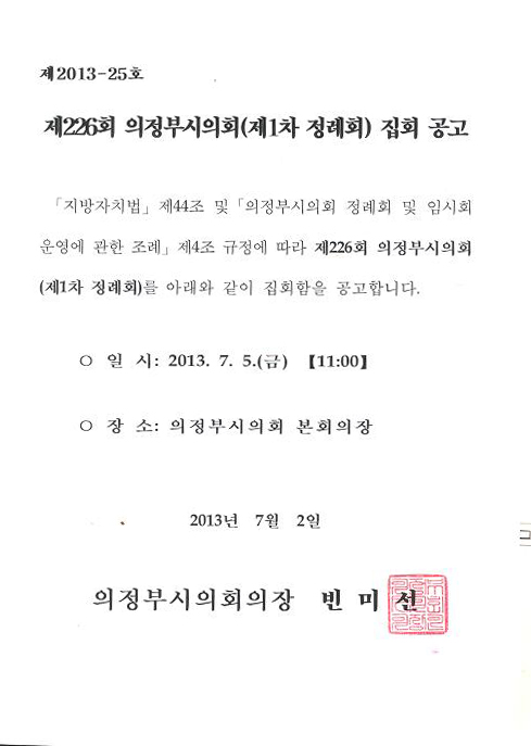 제226회 의정부시의회(제1차 정례회) 집회 공고 관리자 2013-07-03 25