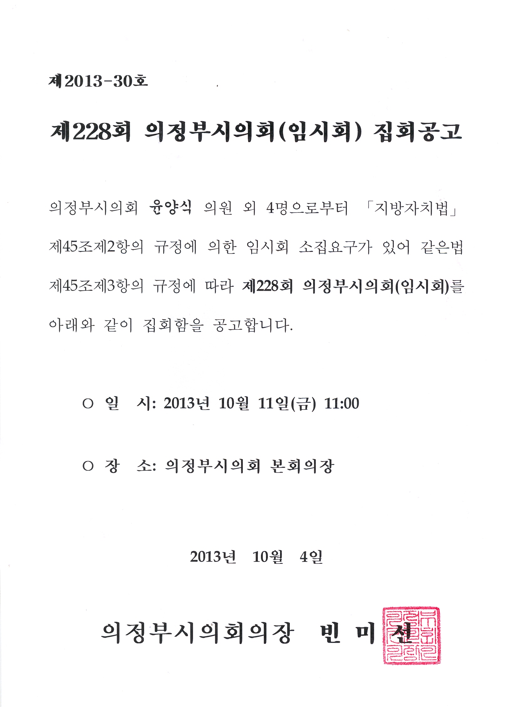 제228회 의정부시의회(임시회) 집회공고 및 의사일정 관리자 2013-10-04 40