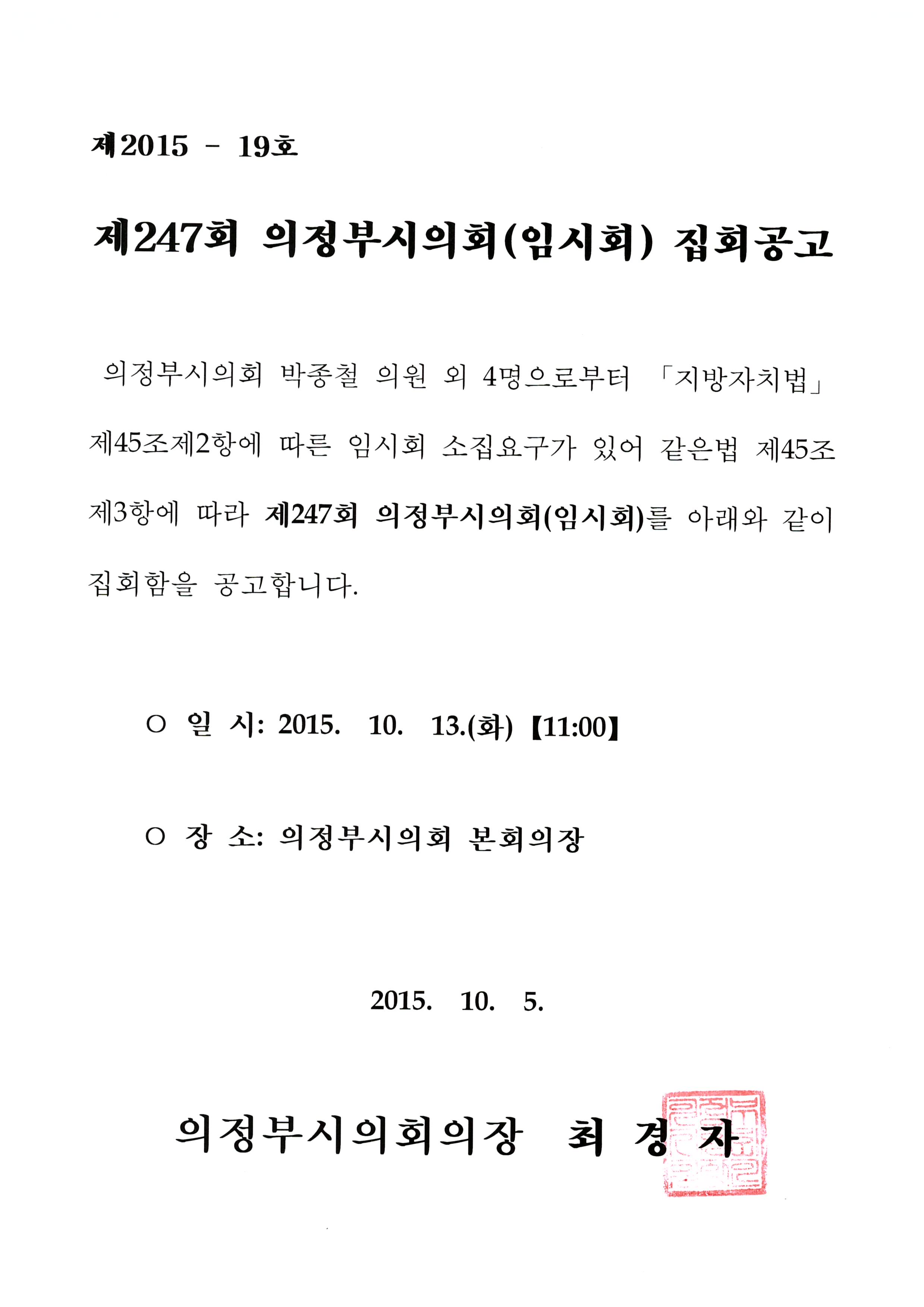제247회 의정부시의회(임시회) 집회공고 1