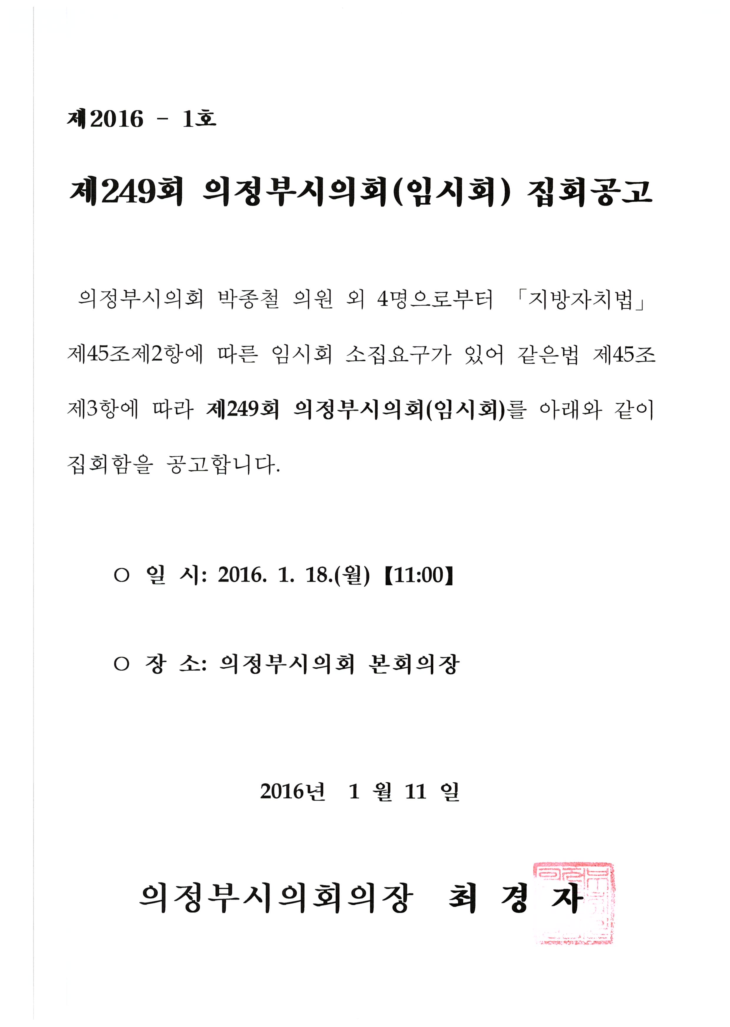 제249회 의정부시의회(임시회) 집회공고 관리자 2016-01-11 120