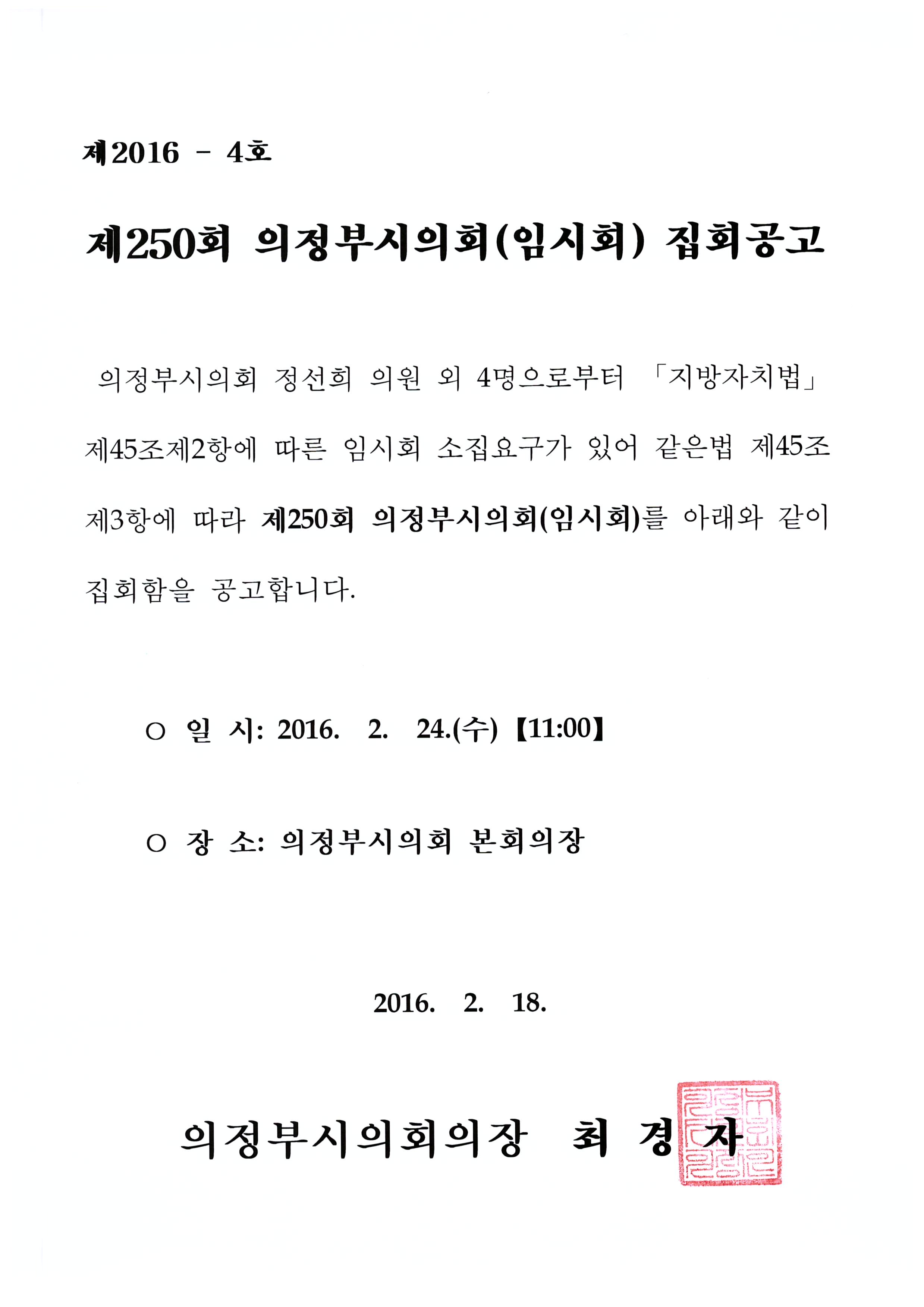 제250회 의정부시의회(임시회) 집회 공고 관리자 2016-02-18 50