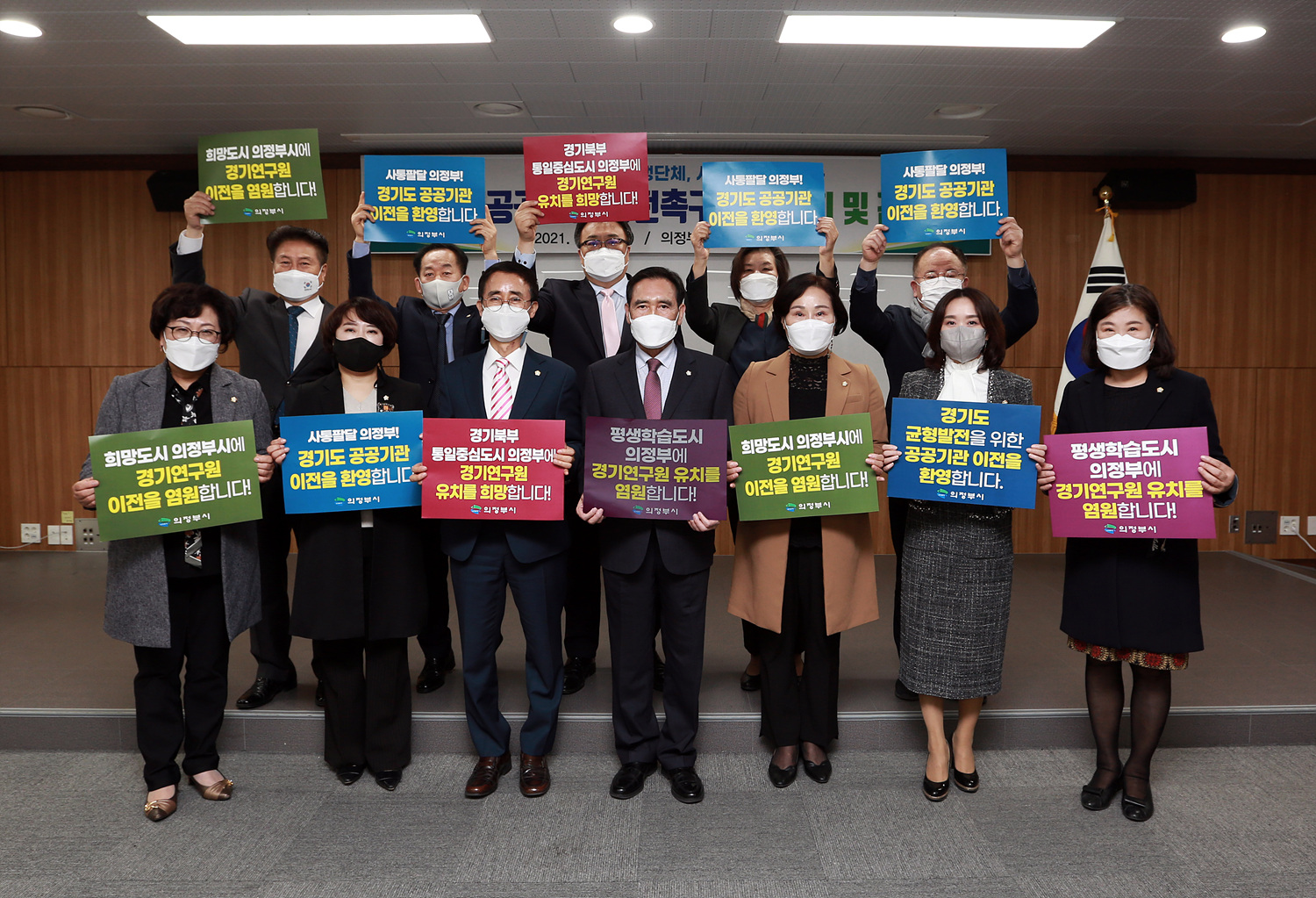 의정부시의회(의장 오범구)는 31일 의정부시청 신관교육장에서 오범구 의정부시의회 의장을 비롯하여 시·도의원, 의정부시, 시민대표(의정부시 주민자치위원장협의회장, 통장협의회장, 새마을협의회장, 바르게살기운동협의회장, 한국자유총연맹회장)와 함께 의정부시 유치에 대한‘경기도 공공기관 이전 촉구결의 대회’에 참석하여 하나의 목소리를 내었다. 이날 결의대회는 경기도 공공기관 3차 이전 유치인 경기 북·동부 이전을 적극 환영하며, 이 중에서도 의정부시의 비전을 실현시킬 ‘경기연구원’을 의정부시에 유치해야 한다는 강력한 의지를 표명하기 위해 개최되었다. 의정부시의회 의원들은 “의정부시는 군사시설보호구역으로 묶여 개발에 제한을 받으며, 대한민국의 군사도시로서의 희생을 감내해 왔다. 경기북부 지역 균형발전을 위해 경기도 공공기관 유치는 경기북부 통일중심도시인 의정부시가 최적지이다”라고 강조 하였으며, 오범구 의장은 “의정부시는 오늘의 결의를 통해 경기북부 수부도시로서의 의정부시 이미지를 새롭게 구축하는 마중물이 되길 희망한다며, 시·도의원 및 시민대표들께서 각자의 영역에서 힘이 되어주시길 당부드린다”고 말했다.