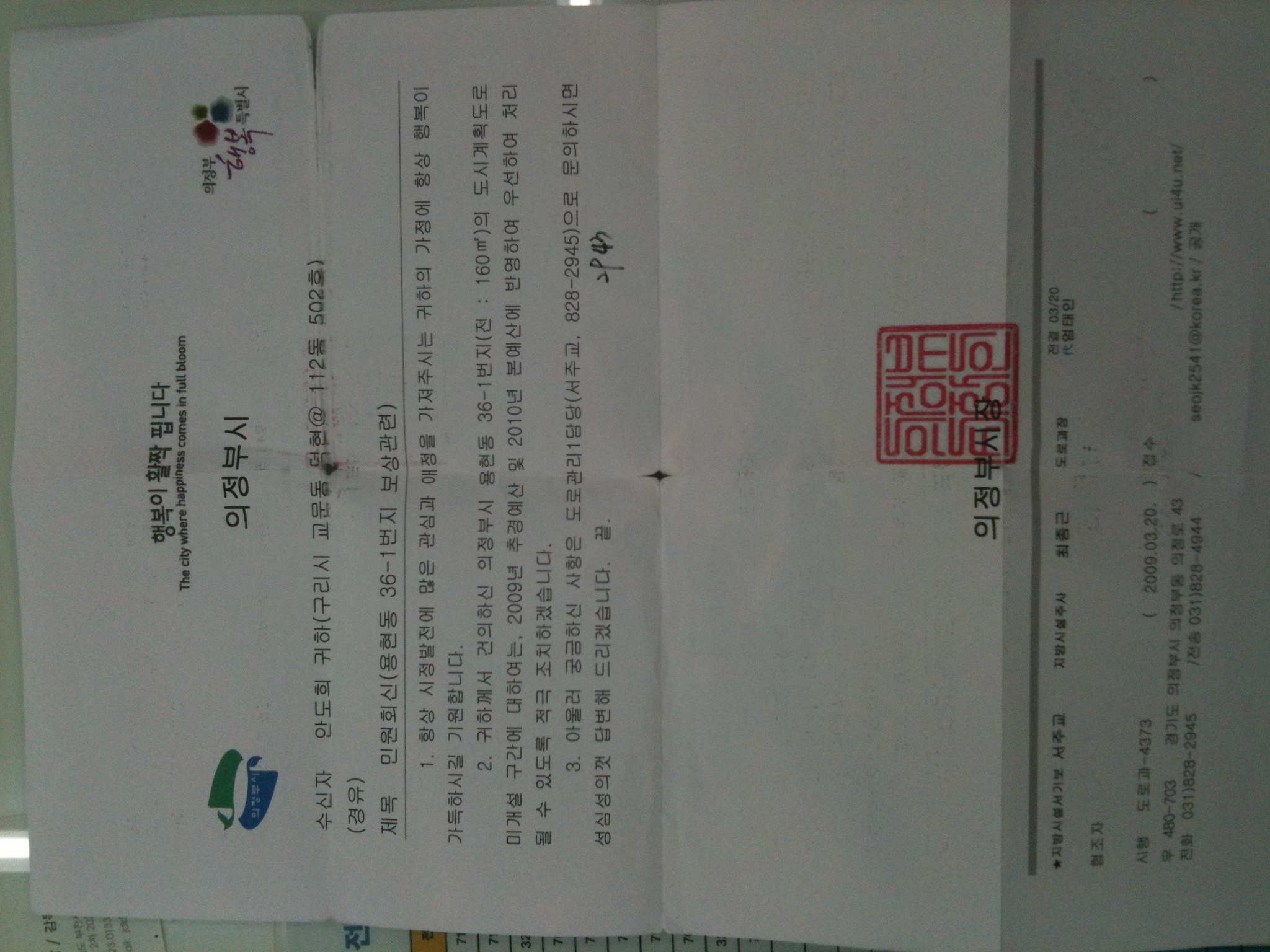 - 시정에 관한 사항으로 시청에서 답변해야 할 사항, 시청에 이미 접수되어 처리 예정이거나 처리하고 있는 사항 등은 답변을 하지 않으며, 그 밖의 시정에 대한 개선사항과 일상생활에서의 불편사항, 시청 공무원의 업무 태도 관련 등은 '의정부시청 관계부서에서 처리하여야 할 사항으로 의정부시청 홈페이지(www.ui4u.go.kr) 열린민원 -> 의정부시에 바란다'를 이용하시기 바랍니다. 민원신청