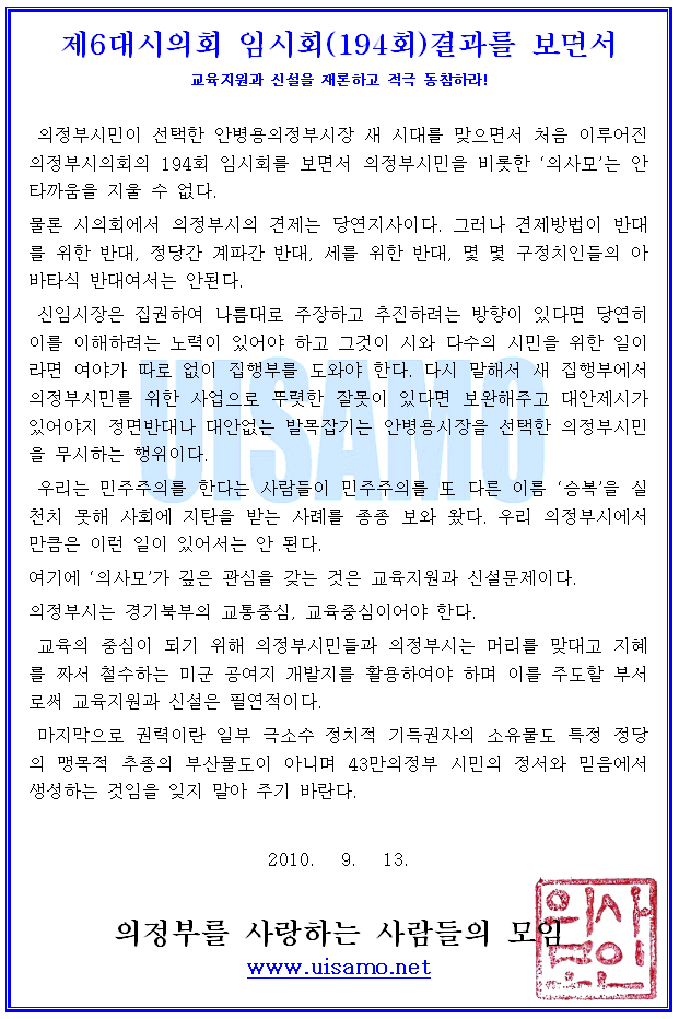 제6대시의회 임시회(194회)결과를 보면서 교육지원과 신설을 재론하고 적극 동참하라!   의정부시민이 선택한 안병용의정부시장 새 시대를 맞으면서 처음 이루어진 의정부시의회의 194회 임시회를 보면서 의정부시민을 비롯한 &lsquo의사모&rsquo는 안타까움을 지울 수 없다. 물론 시의회에서 의정부시의 견제는 당연지사이다. 그러나 견제방법이 반대를 위한 반대, 정당간 계파간 반대, 세를 위한 반대, 몇 몇 구정치인들의 아바타식 반대여서는 안된다. 신임시장은 집권하여 나름대로 주장하고 추진하려는 방향이 있다면 당연히 이를 이해하려는 노력이 있어야 하고 그것이 시와 다수의 시민을 위한 일이라면 여야가 따로 없이 집행부를 도와야 한다. 다시 말해서 새 집행부에서 의정부시민를 위한 사업으로 뚜렷한 잘못이 있다면 보완해주고 대안제시가 있어야지 정면반대나 대안없는 발목잡기는 안병용시장을 선택한 의정부시민을 무시하는 행위이다. 우리는 민주주의를 한다는 사람들이 민주주의를 또 다른 이름 &lsquo승복&rsquo을 실천치 못해 사회에 지탄을 받는 사례를 종종 보와 왔다. 우리 의정부시에서 만큼은 이런 일이 있어서는 안 된다. 여기에 &lsquo의사모&rsquo가 깊은 관심을 갖는 것은 교육지원과 신설문제이다. 의정부시는 경기북부의 교통중심, 교육중심이어야 한다. 교육의 중심이 되기 위해 의정부시민들과 의정부시는 머리를 맞대고 지혜를 짜서 철수하는 미군 공여지 개발지를 활용하여야 하며 이를 주도할 부서로써 교육지원과 신설은 필연적이다. 마지막으로 권력이란 일부 극소수 정치적 기득권자의 소유물도 특정 정당의 맹목적 추종의 부산물도이 아니며 43만의정부 시민의 정서와 믿음에서 생성하는 것임을 잊지 말아 주기 바란다.   의정부를 사랑하는 사람들의 모임