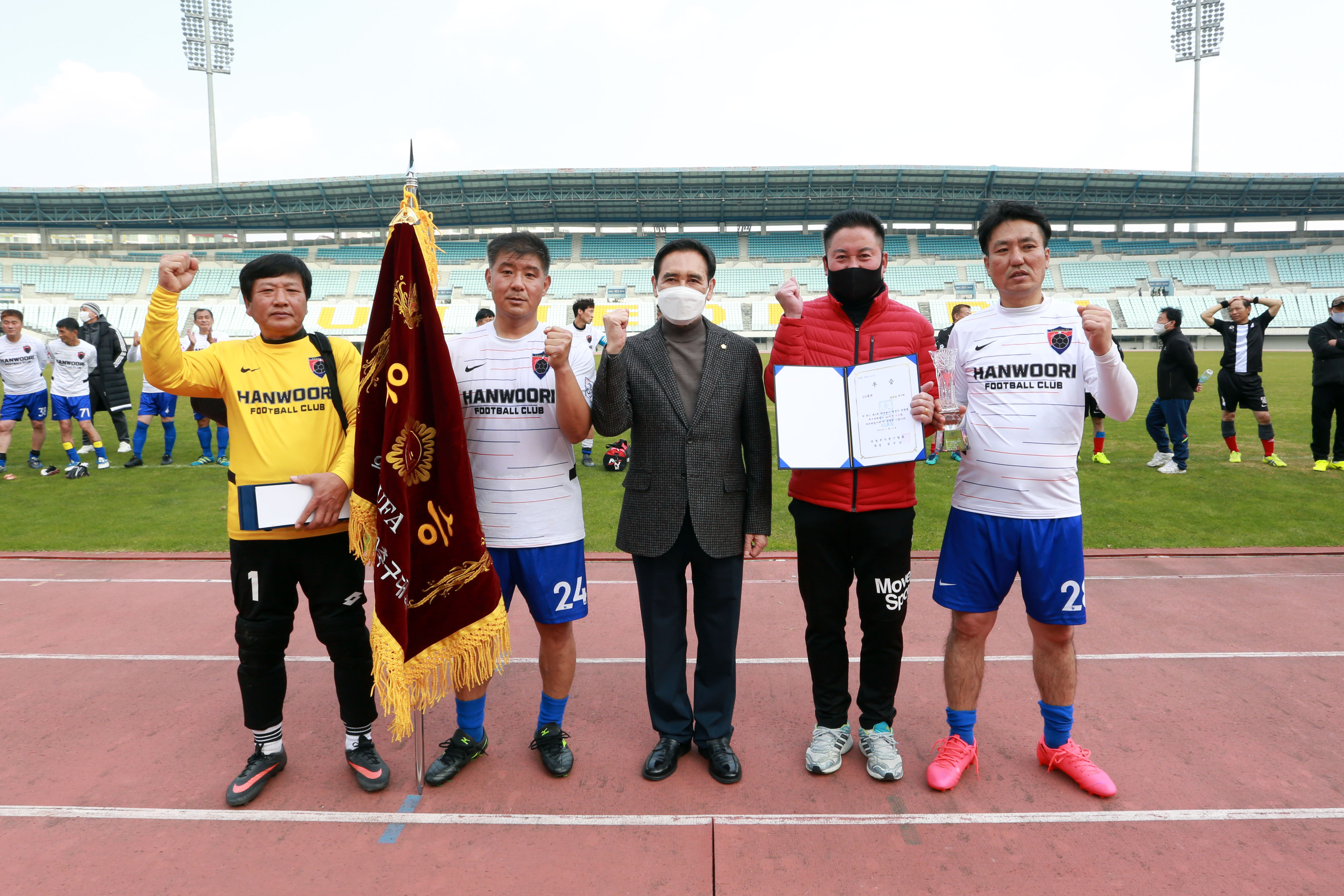 □ 의정부시축구협회에 소속된 50대 이상의 동호인 총 21팀이 지난 7일 예선전을 치러 상위 3팀이 결승전에 진출하였다. 의정부시 종합운동장에서 치러진 결승전에서 한우리 축구회가 우승의 영예를 안았고 준우승은 금오축구회, 3위는 오육회축구회에 돌아갔다. 이번 대회는 코로나 방역지침을 준수하여 각 팀당 25명으로 경기장 입장을 제한하였고 참가 선수들의 백신 접종 증명서도 확인하였다.