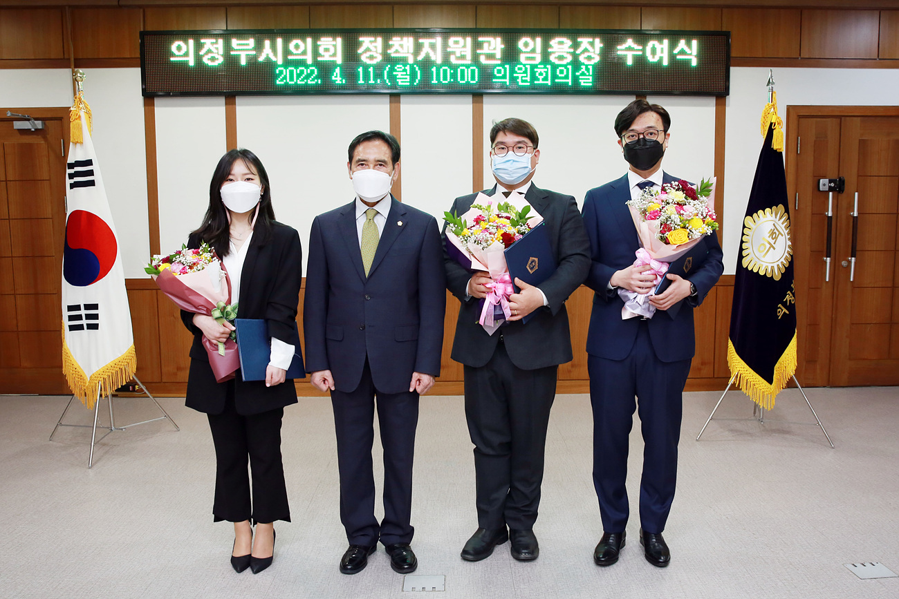 의정부시의회(의장 오범구)는 11일 시의회 3층 의원회의실에서 의원 의정활동을 지원하기 위해 신규 채용한 정책지원관 3명에 대하여 임용장을 교부했다. |