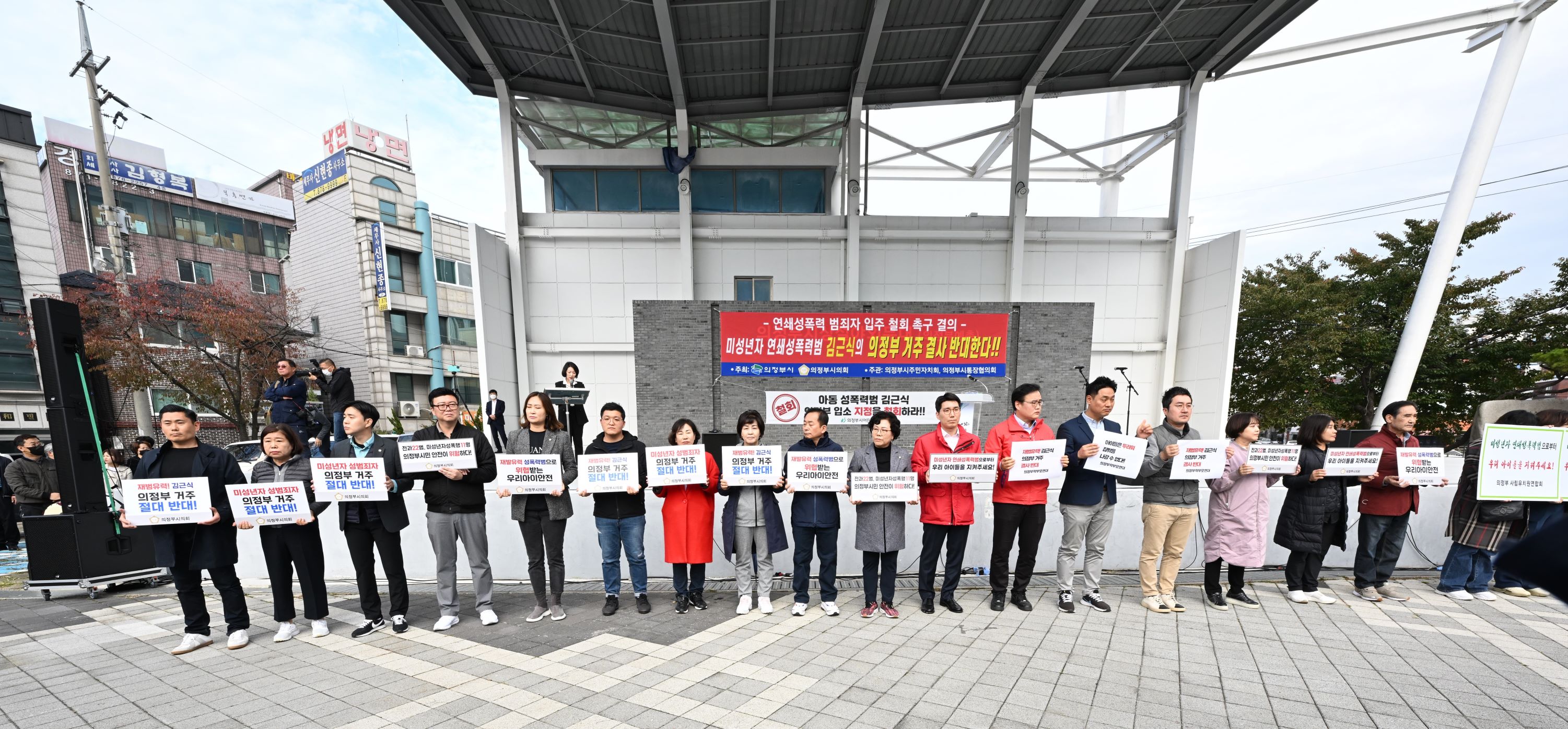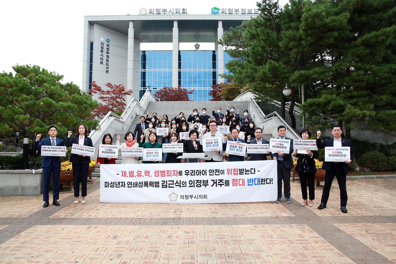 앞서 의정부시의회(의장 최정희)는 김근식의 의정부시 갱생시설 입소 철회를 위해 시와 공동으로 16일 시청 앞 상설 야외무대 앞에서 범시민 결의대회를 주최했다. 의정부시 주민자치회, 통장협의회, 학부모 단체 등 1천여 명이 넘는 의정부시민이 참석하여 김근식 의정부시 시설 입소 지정 철회, 재구속, 녹양동 갱생시설 철거를 촉구하는 목소리를 한마음 한뜻으로 냈다.