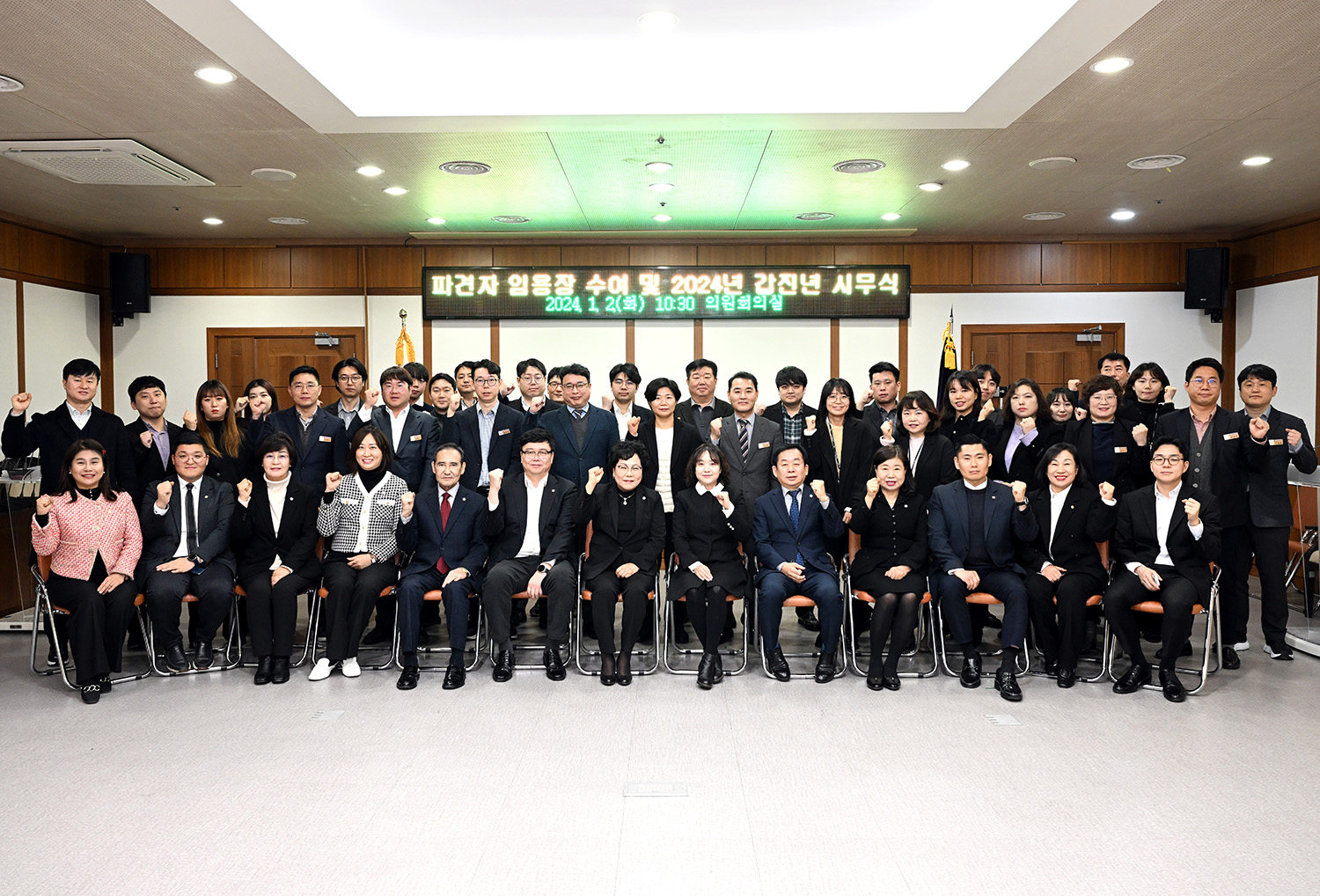 의정부시의회는 2일 시의회 시무식 개최로 갑진년 희망찬 새해를 시작했다. 이날 시무식은 시의회 의원회의실에서 시의원과 사무국 직원들이 참석한 가운데, 2024년 의정활동의 방향을 제시하고 각오를 새롭게 다지는 시간을 가졌다. 또한, 신규로 파견된 공무원에 대한 임용식도 진행되었으며, 사무국 직원들은 전문성과 열정으로 업무를 수행하겠다는 다짐을 표명했다. 최정희 의장은 신년 인사에서 "2024년 갑진년에도 계속해서 주민과 긴밀한 소통을 통해 시민의 행복과 민생 경제 회복을 추구하며, 의회의 전문성과 역량을 강화하여 집행부를 견제하고 시민 중심의 의정활동에 전념하겠다"라고 밝혔다.
