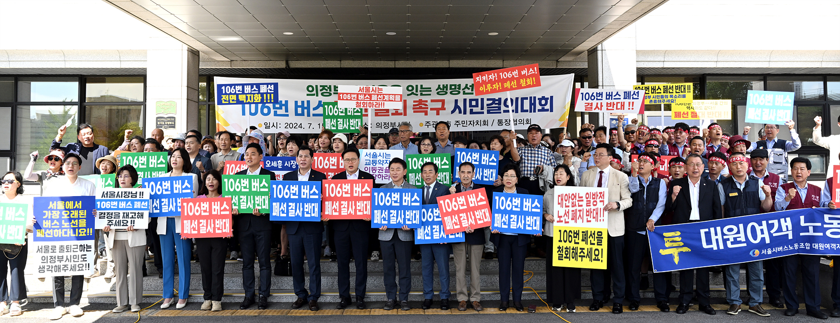 의정부시의회(의장 김연균)는 15일 오전 10시 의정부시청 본관 앞에서 ‘106번 버스 폐선 철회 촉구 시민결의대회’에 동참했다. 이번 결의대회에는 의정부시의회 의원들을 비롯한 의정부시장, 도의원, 의정부시 주민자치회, 통장협의회 등 200여 명의 의정부시민이 참석해 106번 버스 폐선 철회하라는 목소리를 한마음 한뜻으로 냈다. 오는 8월 3일 폐선 예정인 106번 버스는 의정부시 가능동에서 서울시 종로 5가를 운행구간으로 운영되고 있는 버스로, 첫차 운행이 오전 4시부터 시작돼 오전 일찍 출근해야 하는 시민들의 중요한 교통수단이다. 시의회 의원들은 ‘106번 버스 폐선 결사 반대’ 내용이 적힌 피켓을 들고 시민들과 함께 항의하며, 106번 버스의 폐선으로 초래될 시민들의 교통 불편을 우려했다.