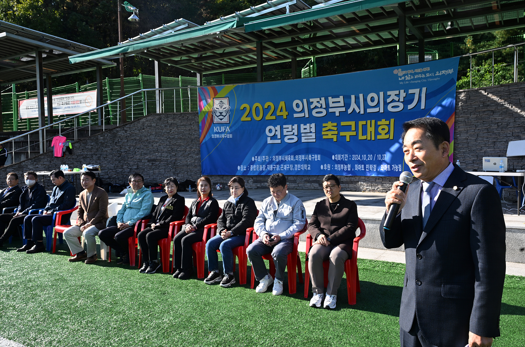 의정부시의회(의장 김연균)는 20일 ‘2024년 제6회 의정부시 의장기 축구대회’가 의정부종합운동장, 곤제근린공원 축구장, 직동근린공원 축구장, 경민대학교 축구장에서 성황리에 개막했다고 밝혔다. 이번 대회는 의정부시 축구 동호인들의 화합과 스포츠 경쟁을 통한 축구 활성화를 도모하기 위해 마련되었으며, 1,000여 명의 선수가 참가해 평소 연마한 실력을 선보일 예정이다. 대회는 10월 20일 예선전을 시작으로 27일 결승전이 치러진다. 20일에 열린 개회식에는 김연균 의장과 시의원들이 참석해 선수들과 동호인들을 격려했다.