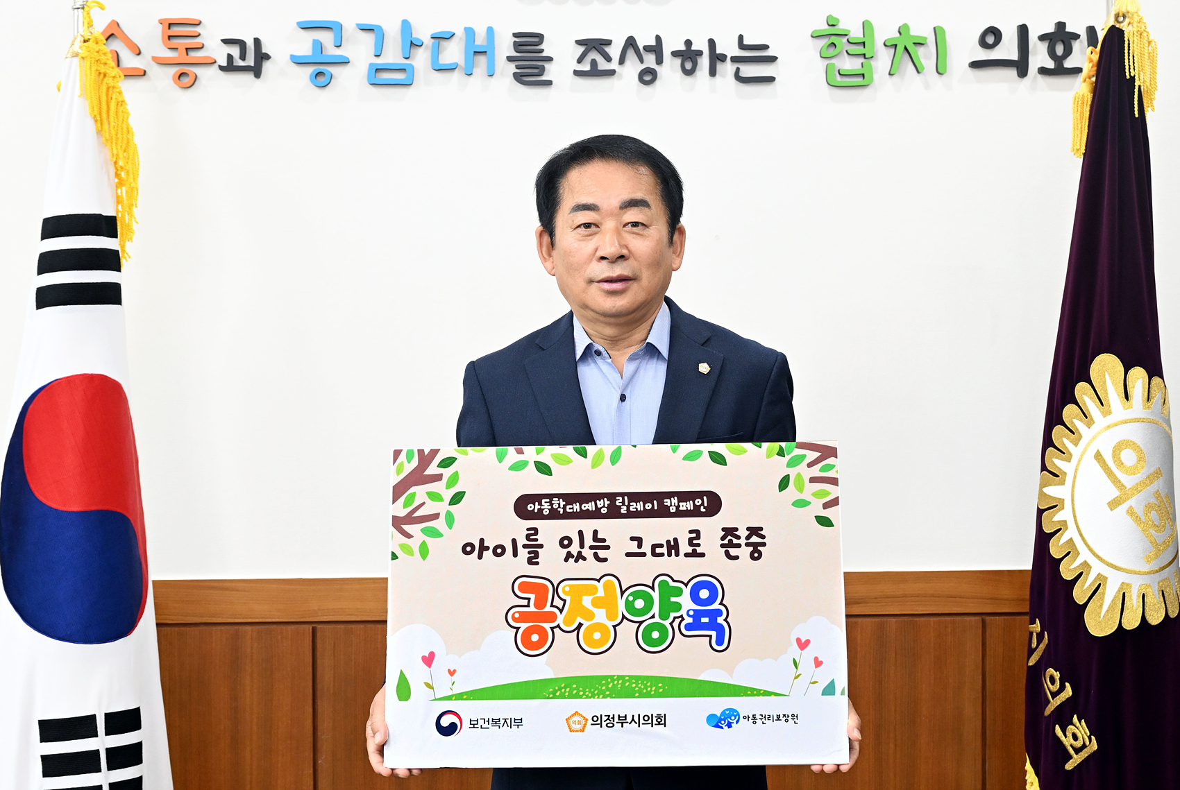 의정부시의회 김연균 의장이 4일 ‘아이를 있는 그대로 존중하는 긍정양육’을 위한 아동학대예방 릴레이 캠페인에 동참했다. 이번 캠페인은 보건복지부 주관으로 아동학대에 대한 사회적 경각심을 높이고, 긍정양육 인식을 확산하기 위해 지난 5월부터 정부 부처 및 공공기관장을 대상으로 진행되고 있는 SNS릴레이 형식의 캠페인으로, 김연균 의장은 지난 10월 18일 김동근 의정부시장의 지목을 받아 캠페인에 참여하게 되었다.